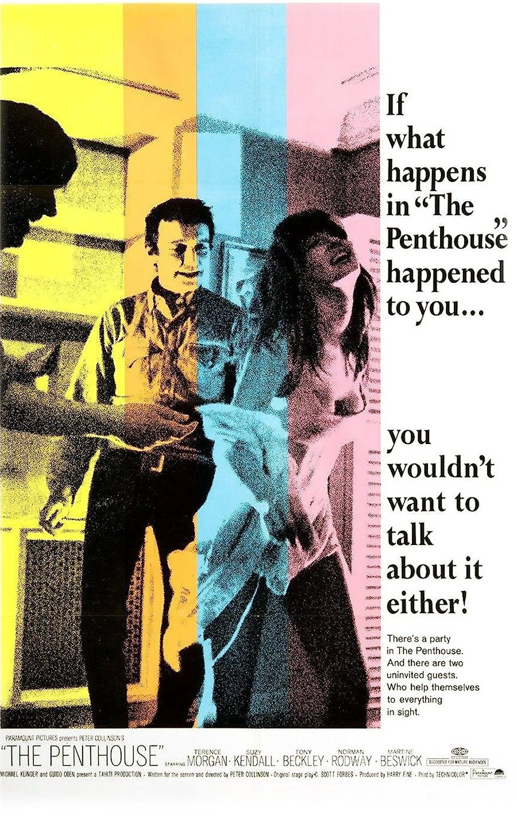The Penthouse is written and directed by Peter Collinson and is an adaptation from the play The Meter Man by Scott Forbes. It stars Suzy Kendall, Terence Morgan, Tony Beckley, Norman Rodway and Martine Beswick. Music is by John Hawksworth and cinematography by Arthur Lavis.