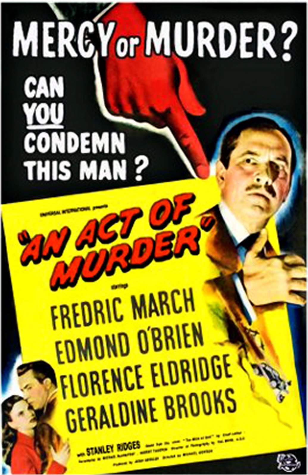 From imdb: Fascinating Film that Daringly Approaches the Subject of Euthanasia. In Doing so it also has Liberal Elements Inserted about the Rigid Judicial System that has a Tendency Toward Antiquated ("Powdered Wigs") by the Book Procedures. Edmond O'Brien is the Lawyer that Questions a Hard-Boiled Judge, while Dating His Daughter. The Judge Played by Fredric March goes through a Tumultuous Time Dealing with His Wife's Terminal Illness. But the Acting Accolades must go to Florence Eldridge who Gives a Riveting Performance. This Thoughtful Piece of Social Commentary is Rich and Rewarding