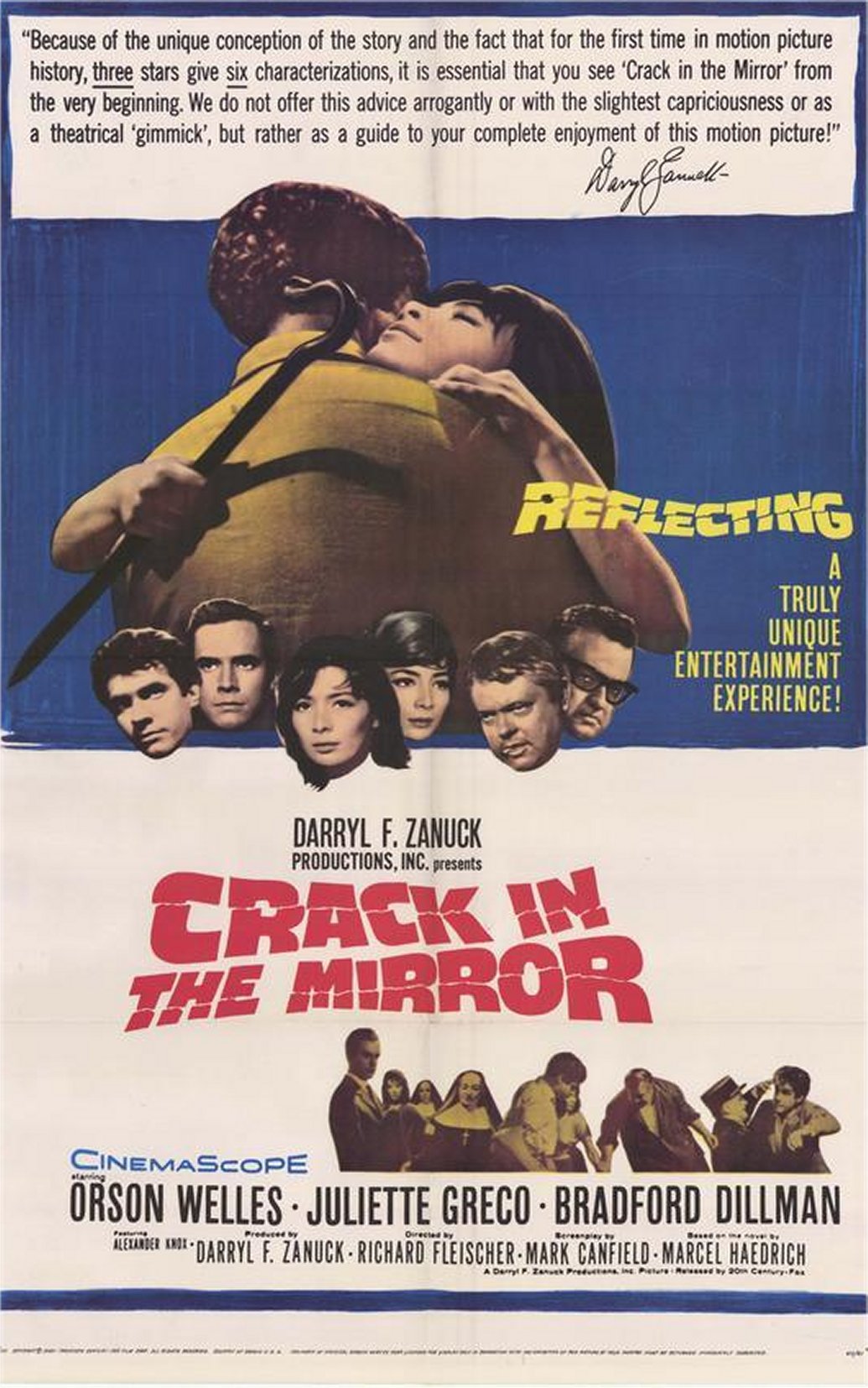 One of the outstanding - albeit forgotten - films of the early 1960s, CRACK IN THE MIRROR is a sizzling, frankly sexual, twist-filled drama with Orson Welles, Juliette Greco and Bradford giving the performances of their careers. (Make that the "two" performances of their careers!) In the first story, lower-class lovers Ms. Greco and Dillman are so in lust that they plan an intricate murder to rid themselves of Ms. Greco's dull husband, Mr. Welles. Now here's the twist. When they are put on trial for manslaughter, the distinguished judge is portrayed by Mr. Welles. And unbeknownst to him, a fellow detective (Mr. Dillman) and Mr. Welles' wife, the lustrous Ms. Greco, are also in heat and plotting to do away with him. To say anything more about this highly original, superbly-acted thriller would do it a disservice. Just SEE it, and savor three actors at their best (under Richard Fleicher's brilliant direction) in a film long-overdue for the