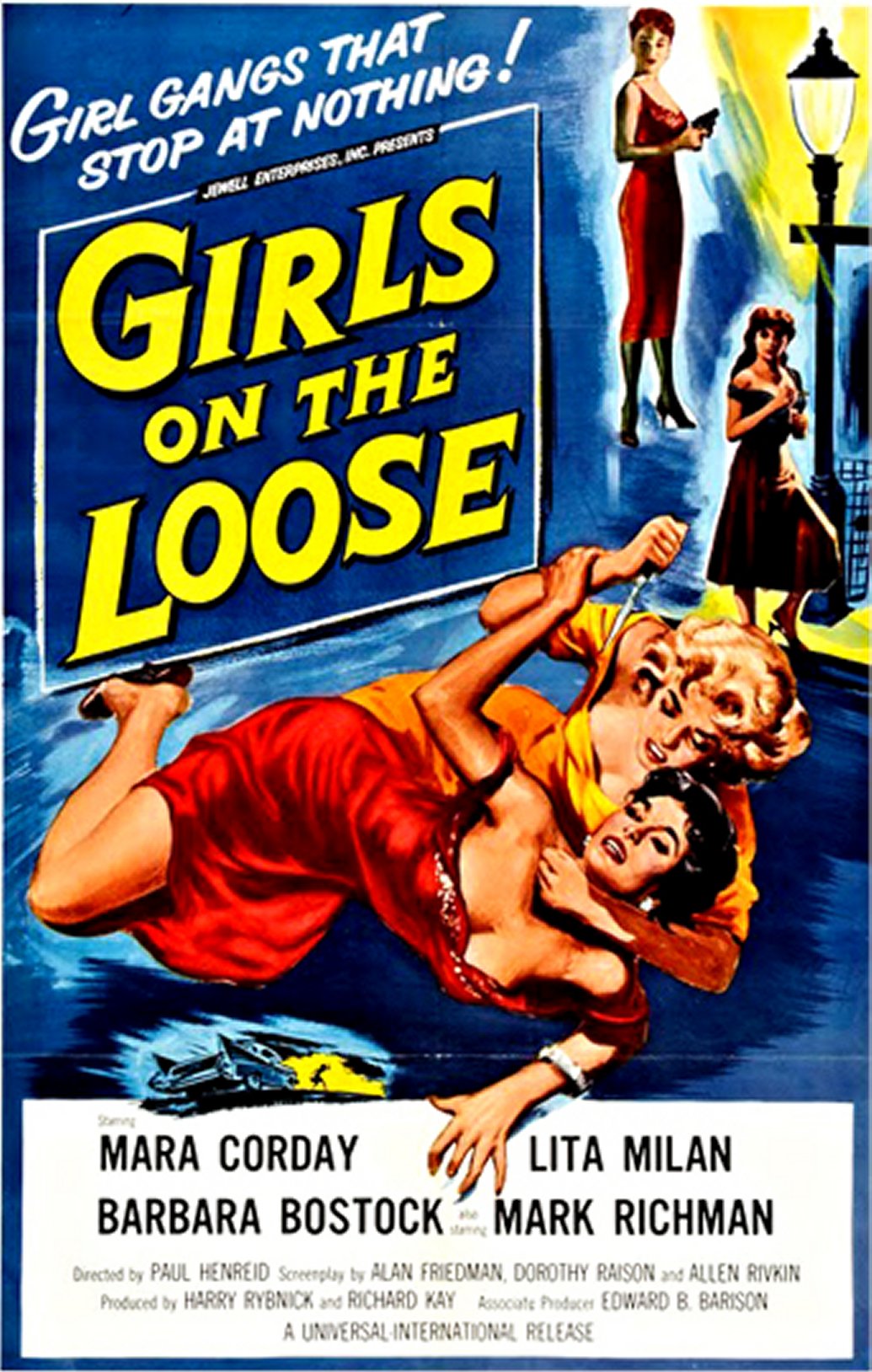 Vera (Mara Corday) runs a nightclub that's really a front for her secret operation: an all-female crime ring that's been pulling off heist after heist. The gang does a major job with the help of Agnes (Abby Dalton), a new recruit and insider with access to a bank's payroll. But then the nervous Agnes threatens to squeal, so Vera has her rubbed out. And when Vera's good-girl sister, Helen (Barbara Bostock), starts dating suspicious policeman Bill (Mark Richman), Vera gets really cutthroat. ~ imdb |